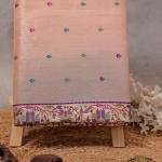 Radiate elegance with this handwoven peach Banarasi saree in pure Katan tissue silk, featuring paithani border and gold kadwa work. Lightweight, luminous, and perfect for weddings or festive occasions. Includes unstitched blouse piece.