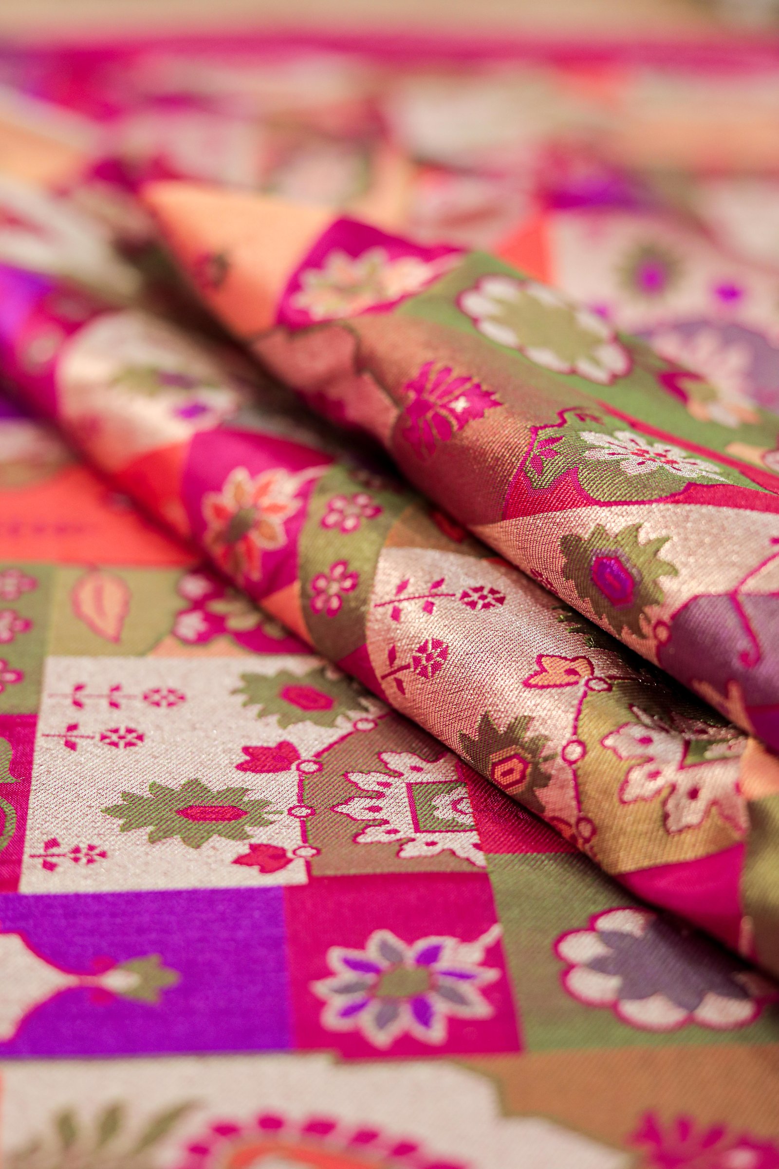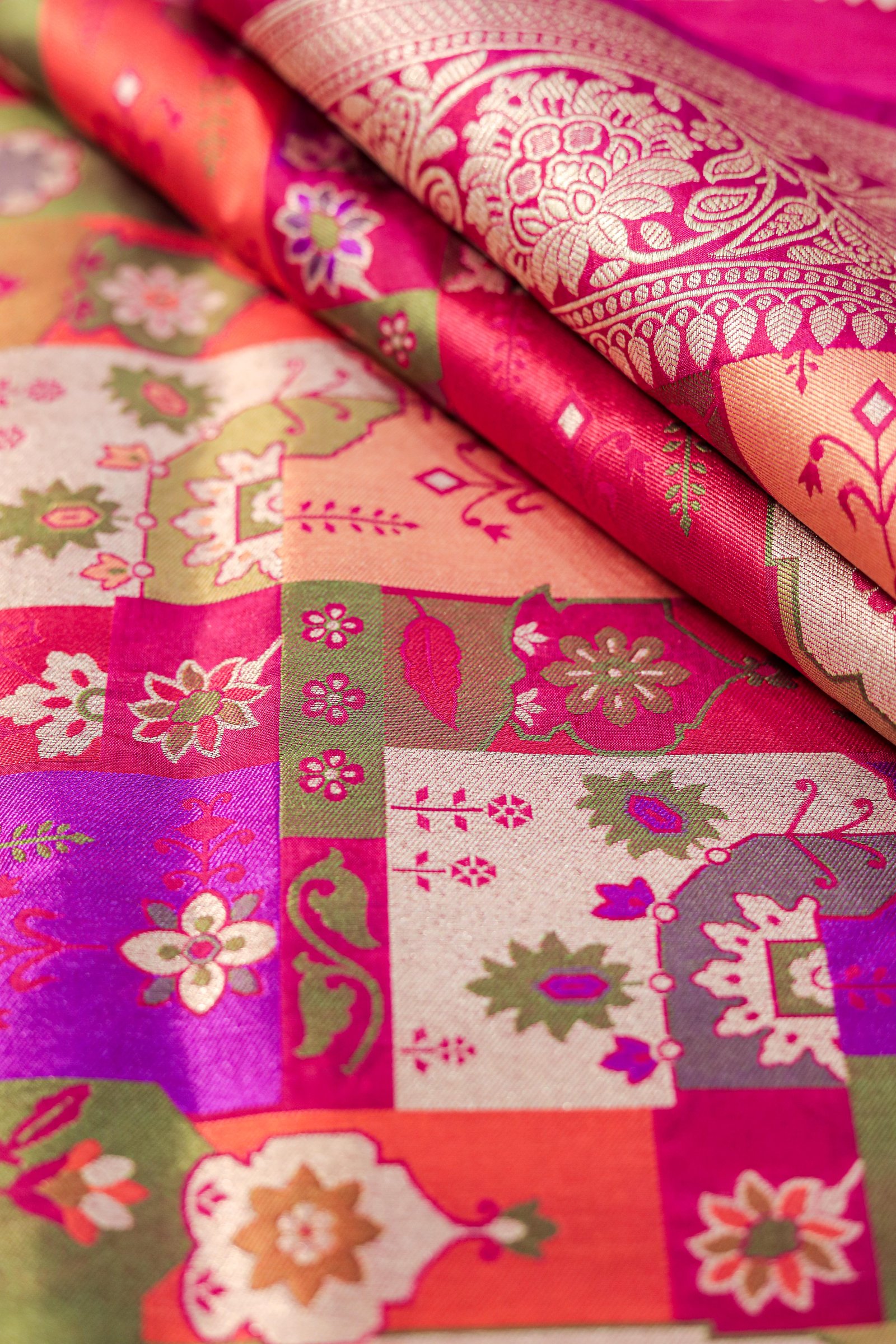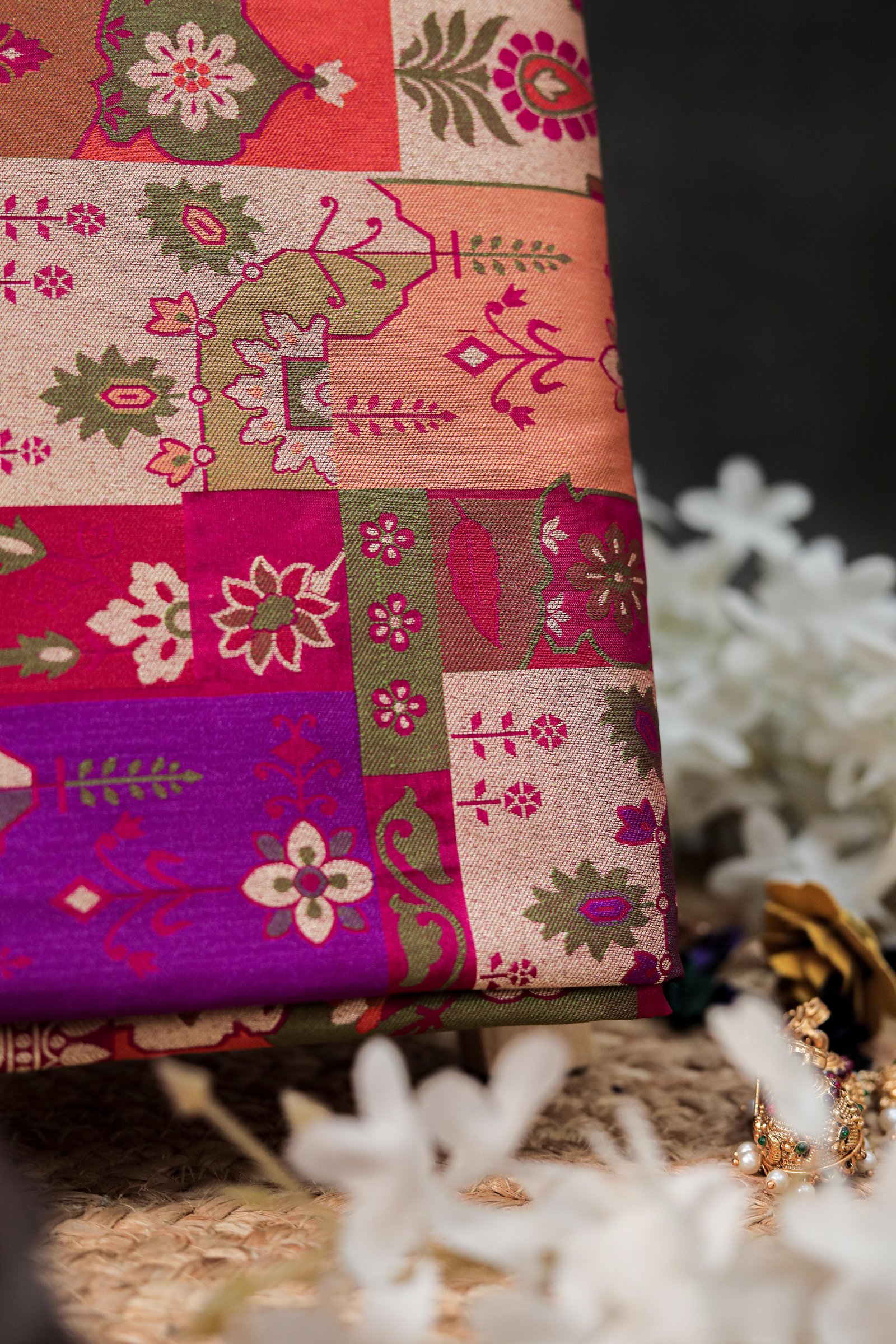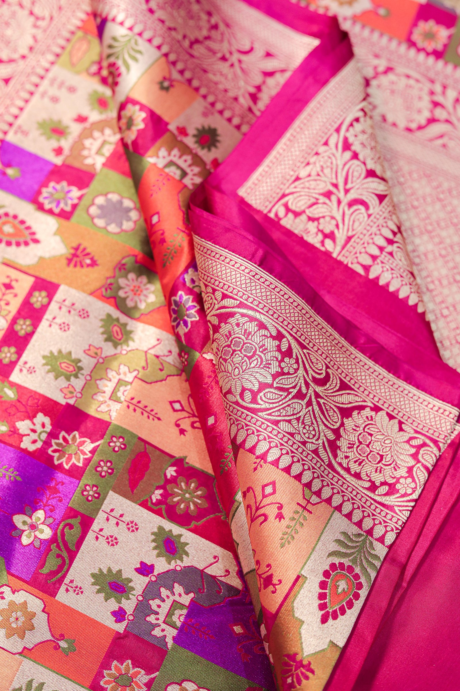 - Work: Handwoven Four-Color Meenakari with Gold Zari
