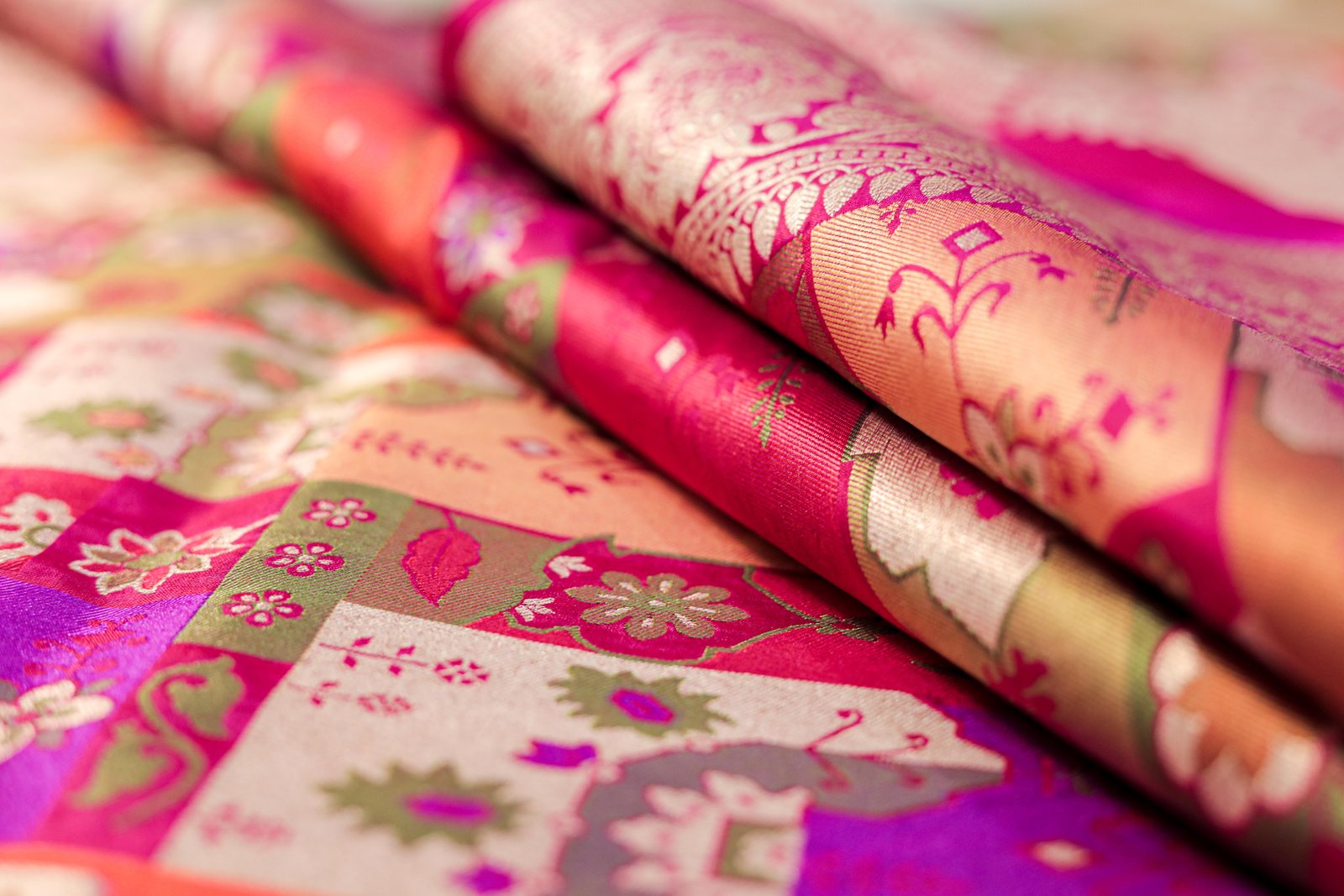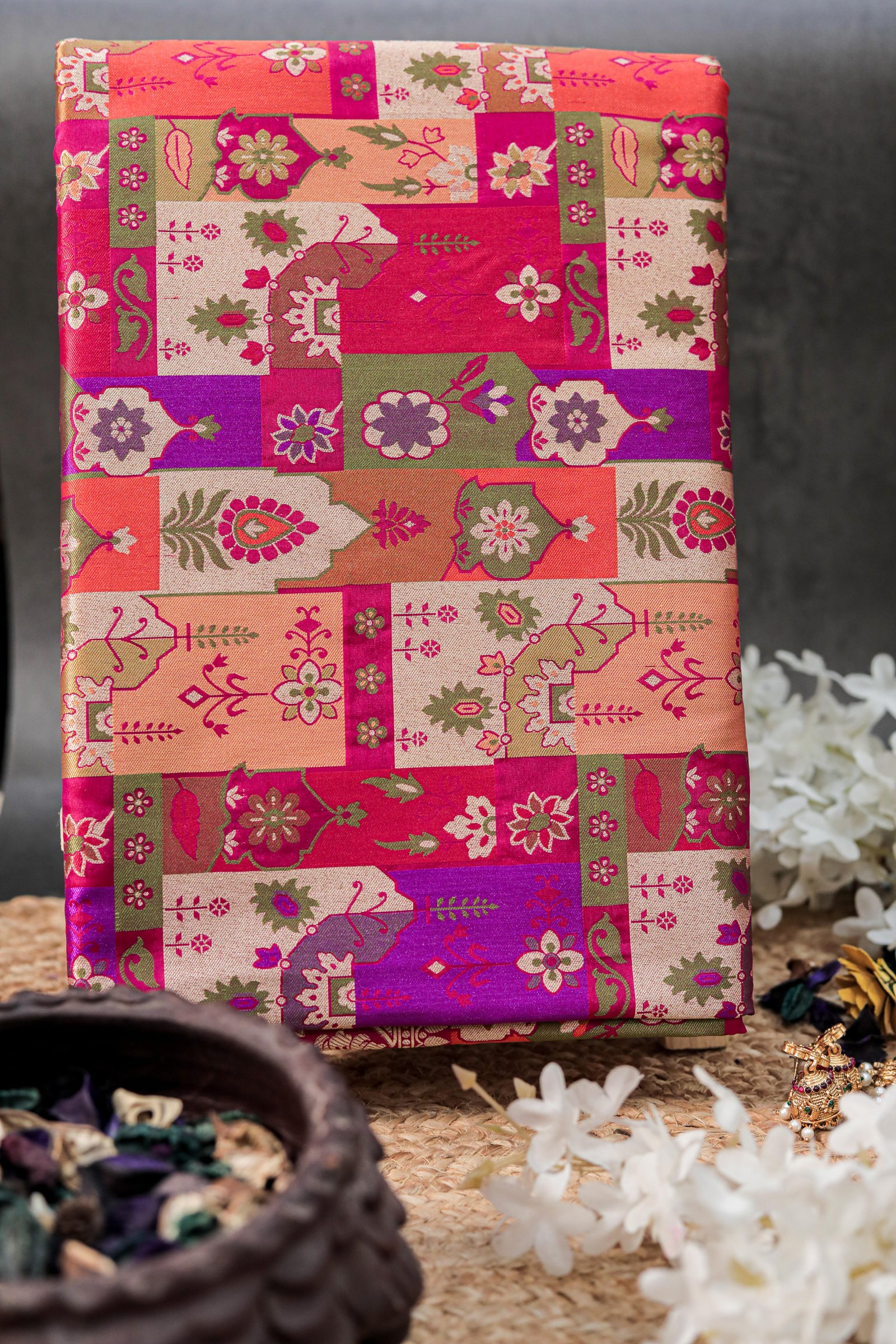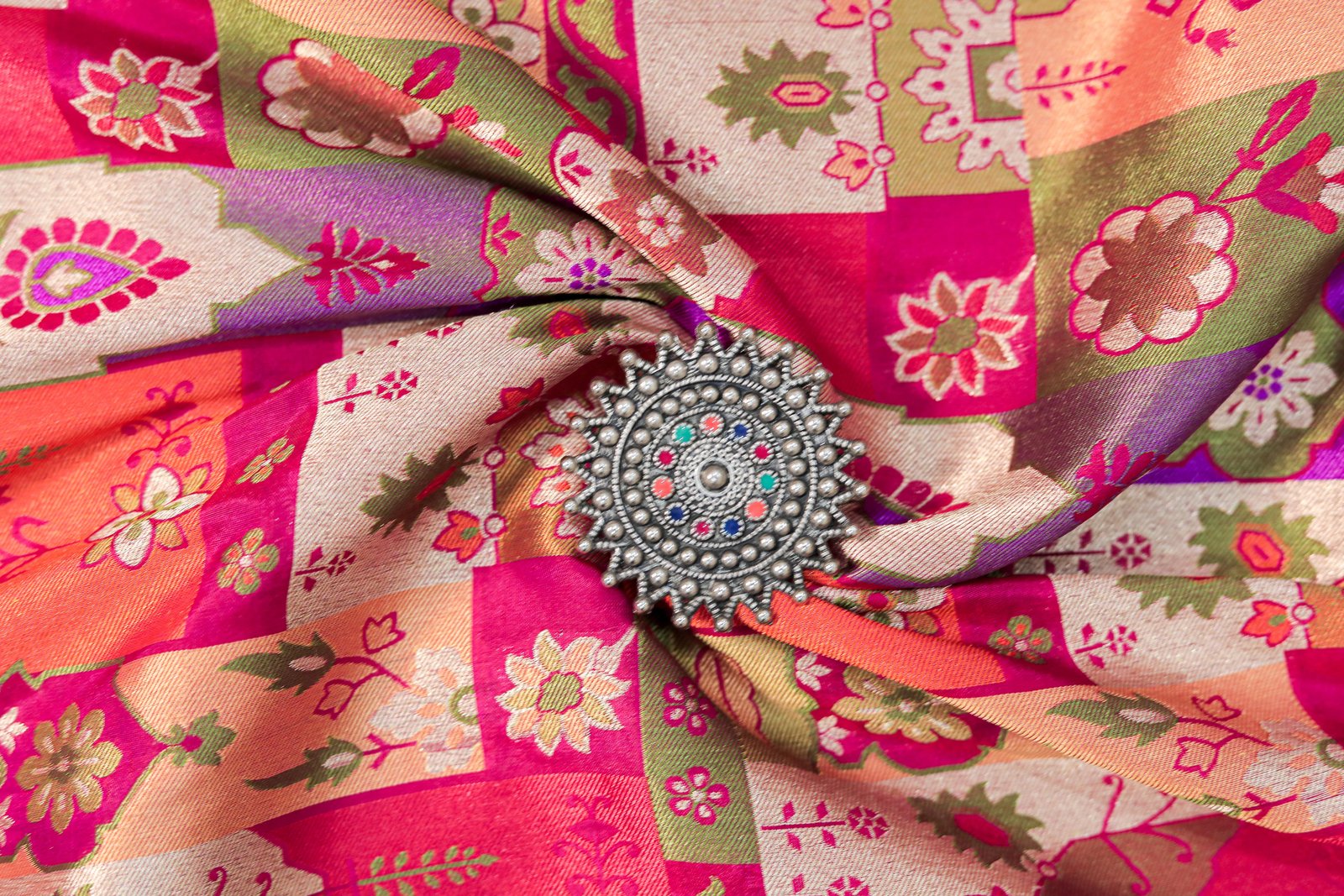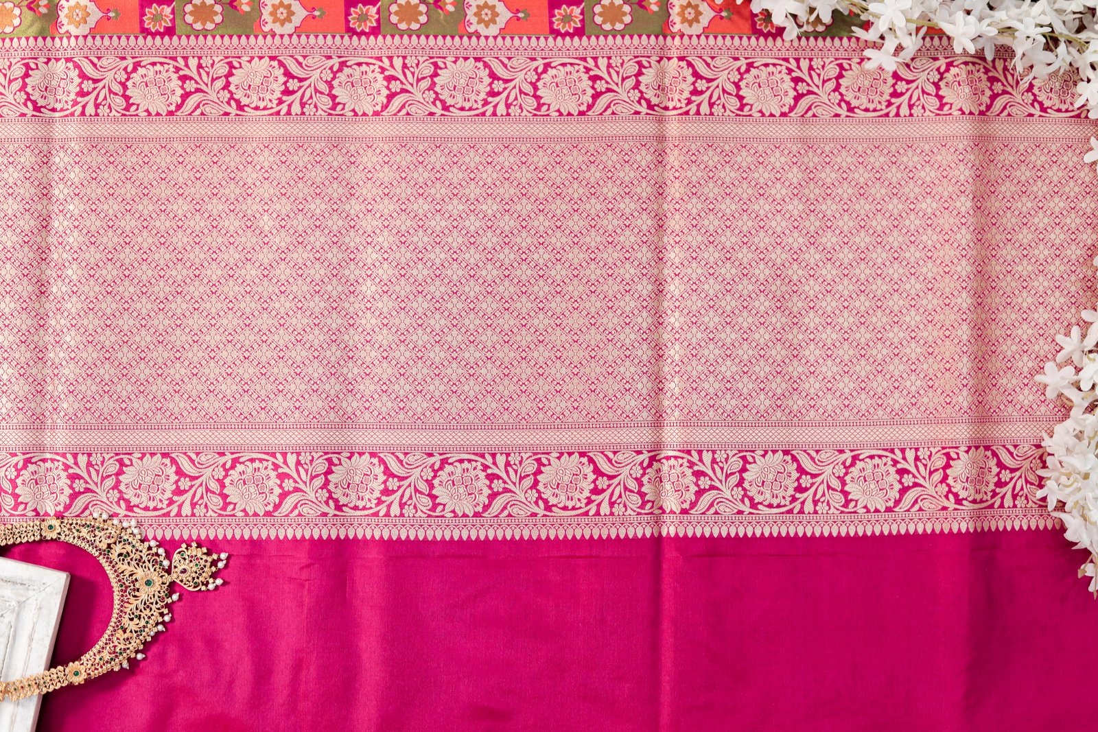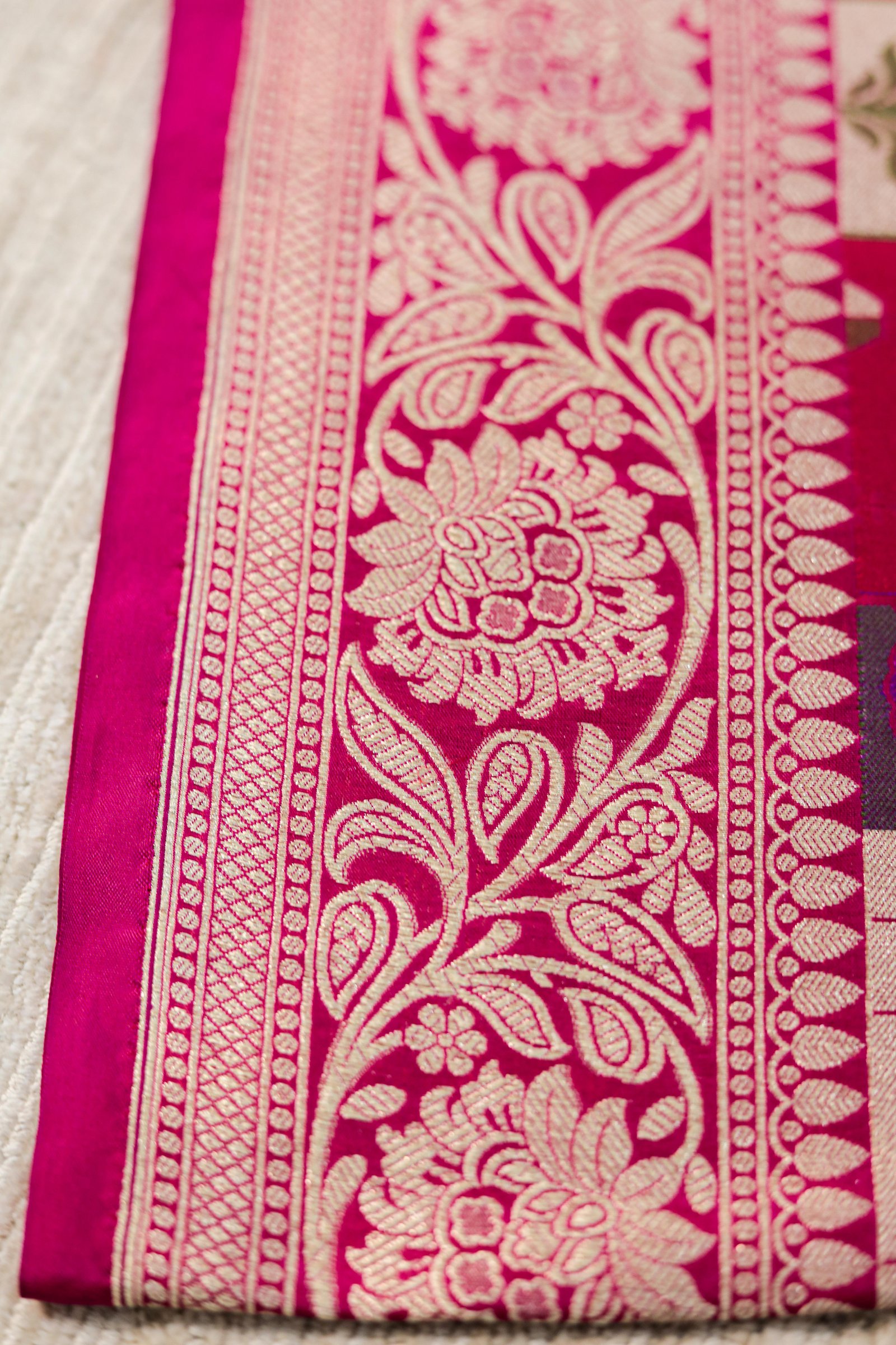 - Work: Handwoven Four-Color Meenakari with Gold Zari