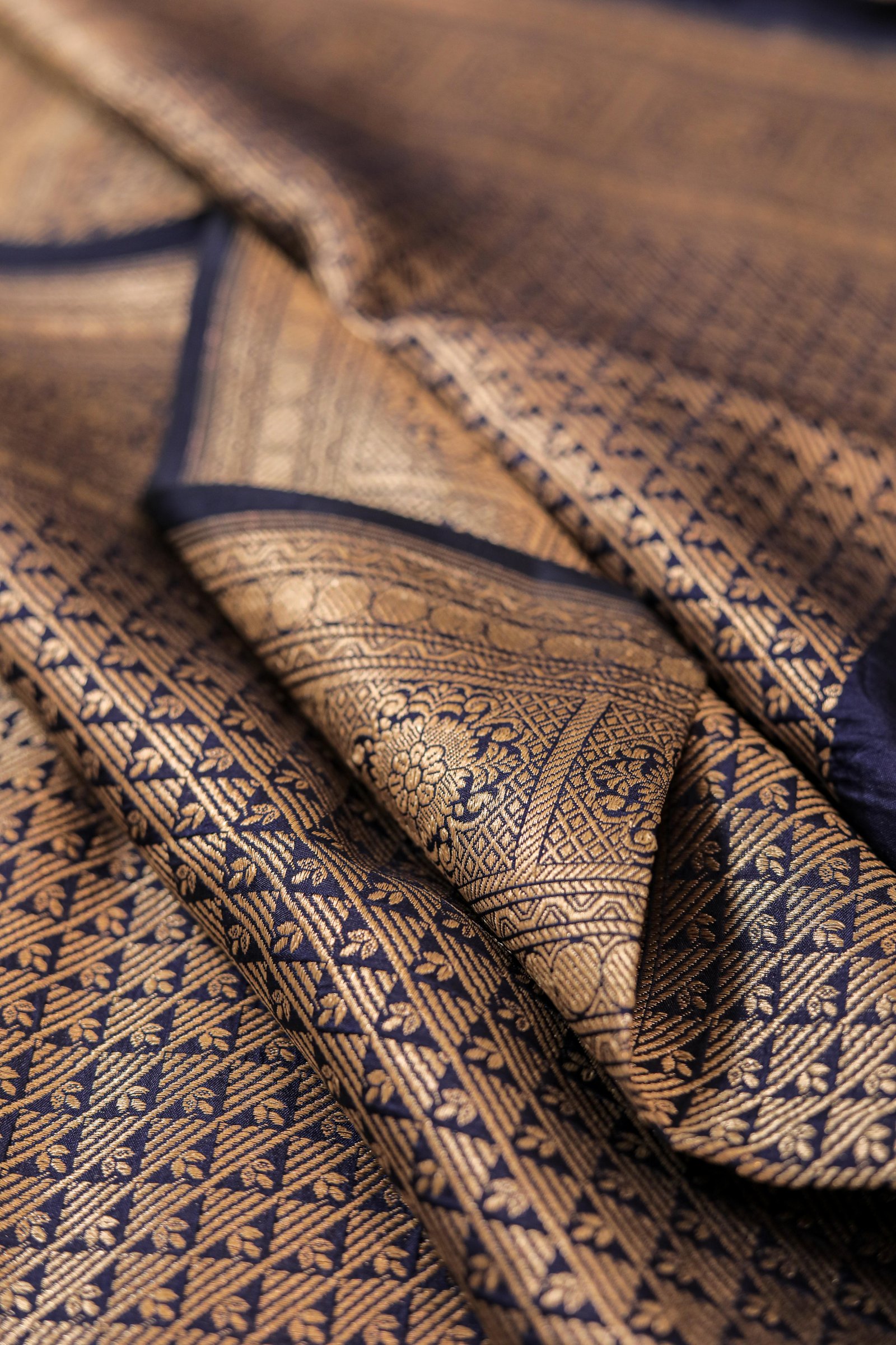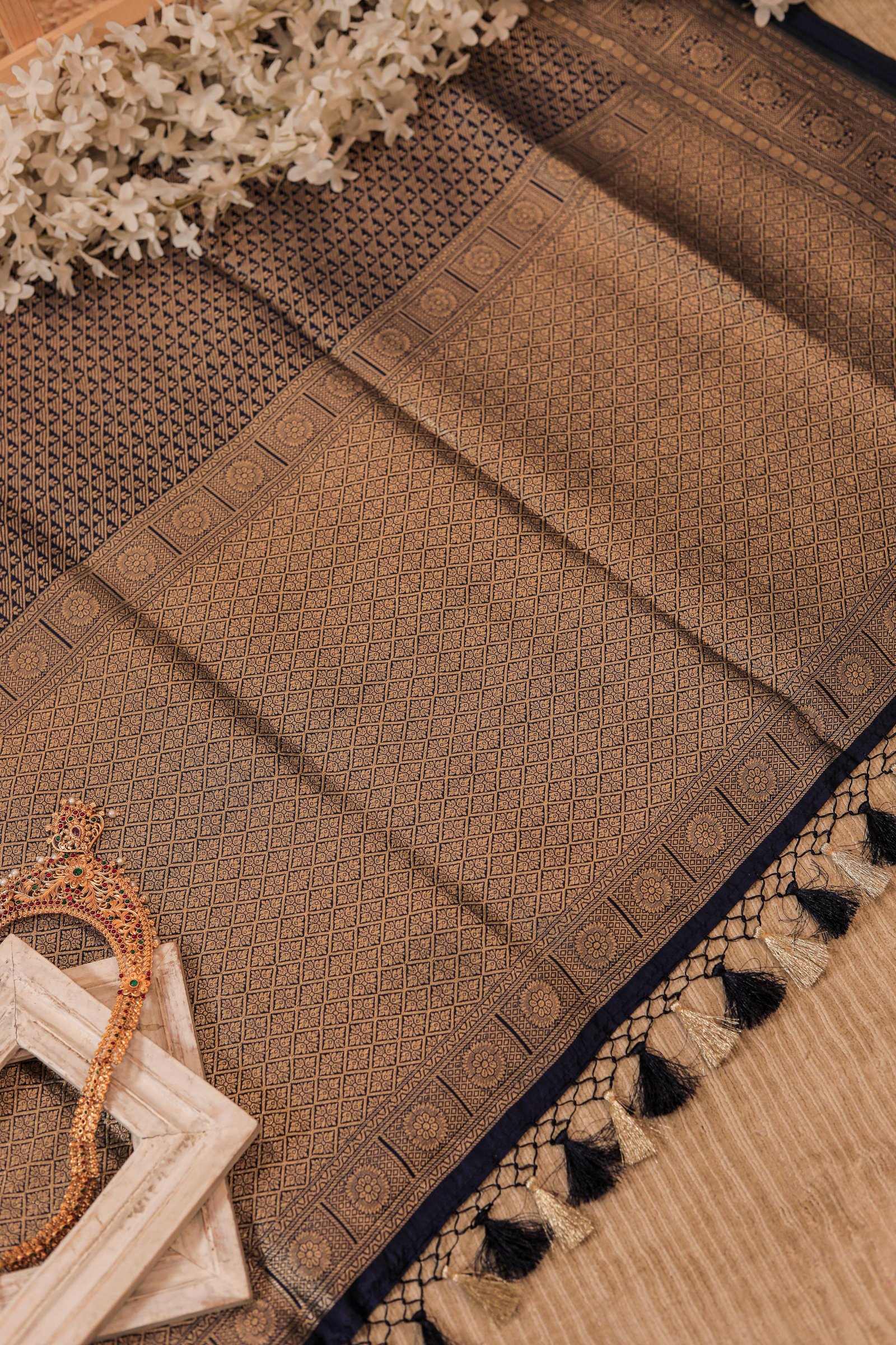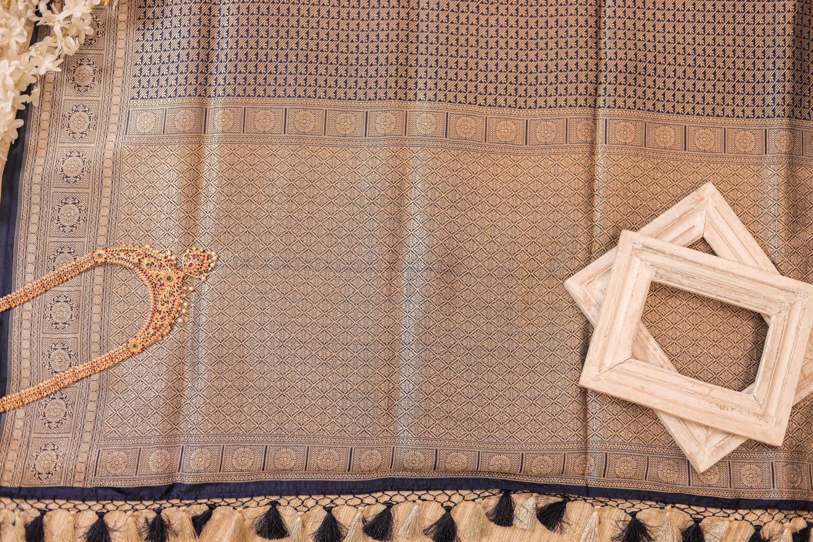 The deep navy blue hue lends a regal and versatile appeal, ideal for weddings, festive occasions, and formal evening events. The saree is beautifully accented with a grand zari border and an ornate pallu, showcasing the magnificence of age-old weaving techniques passed down through generations.