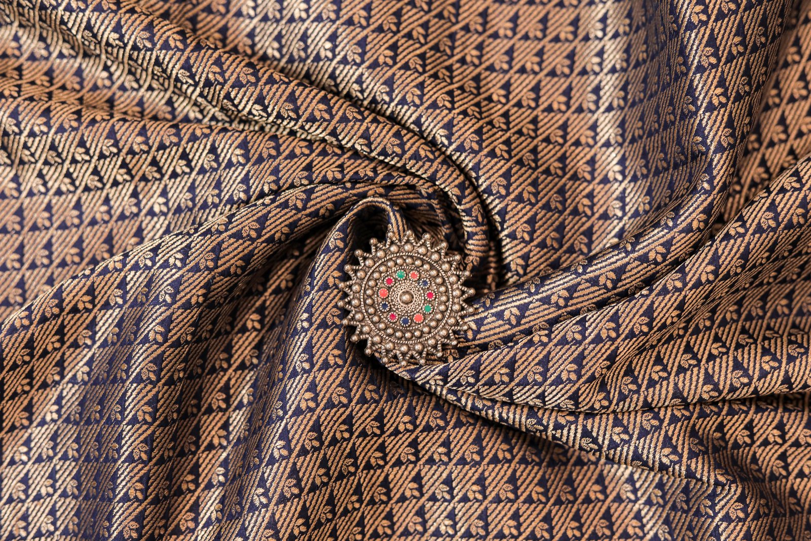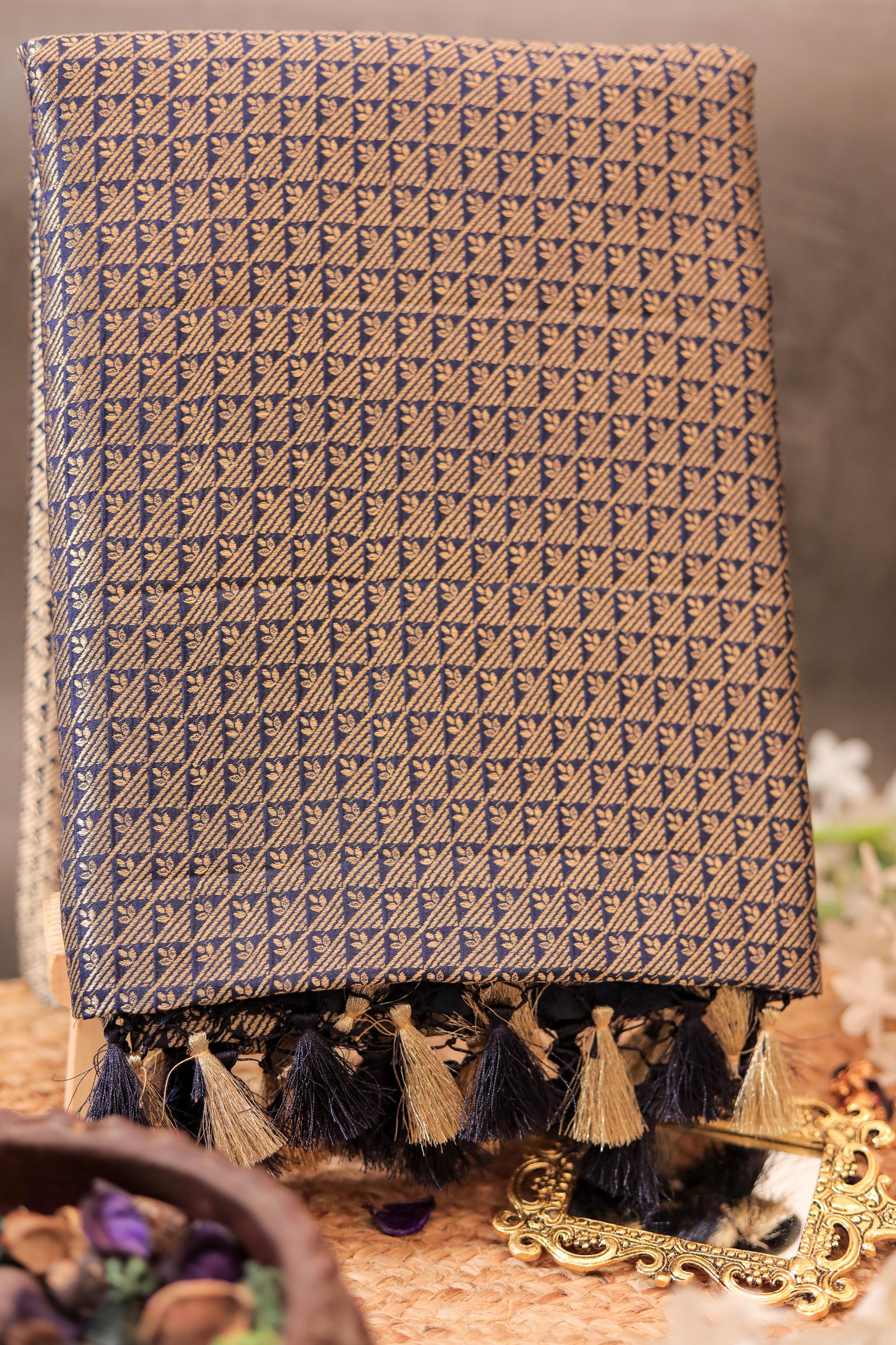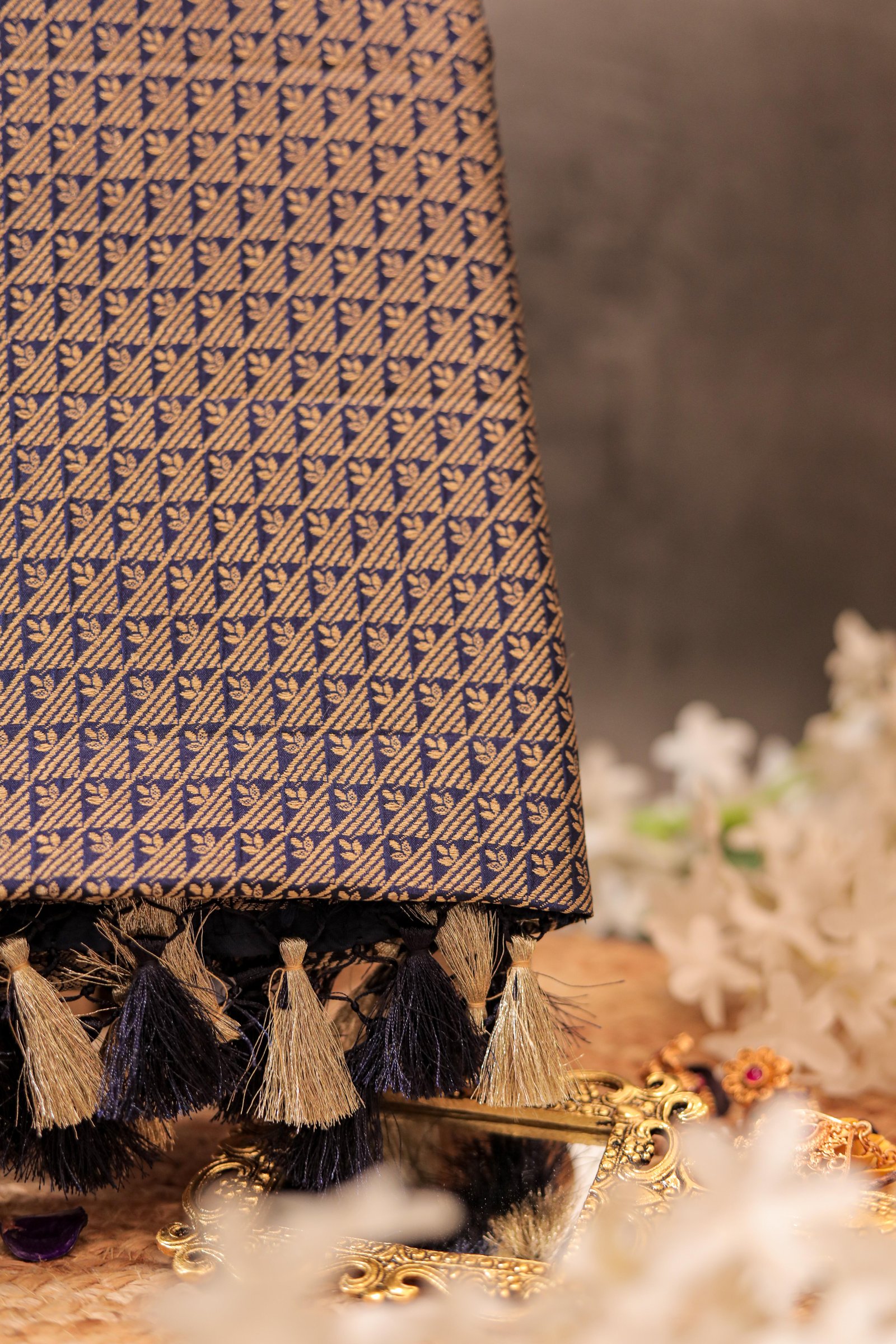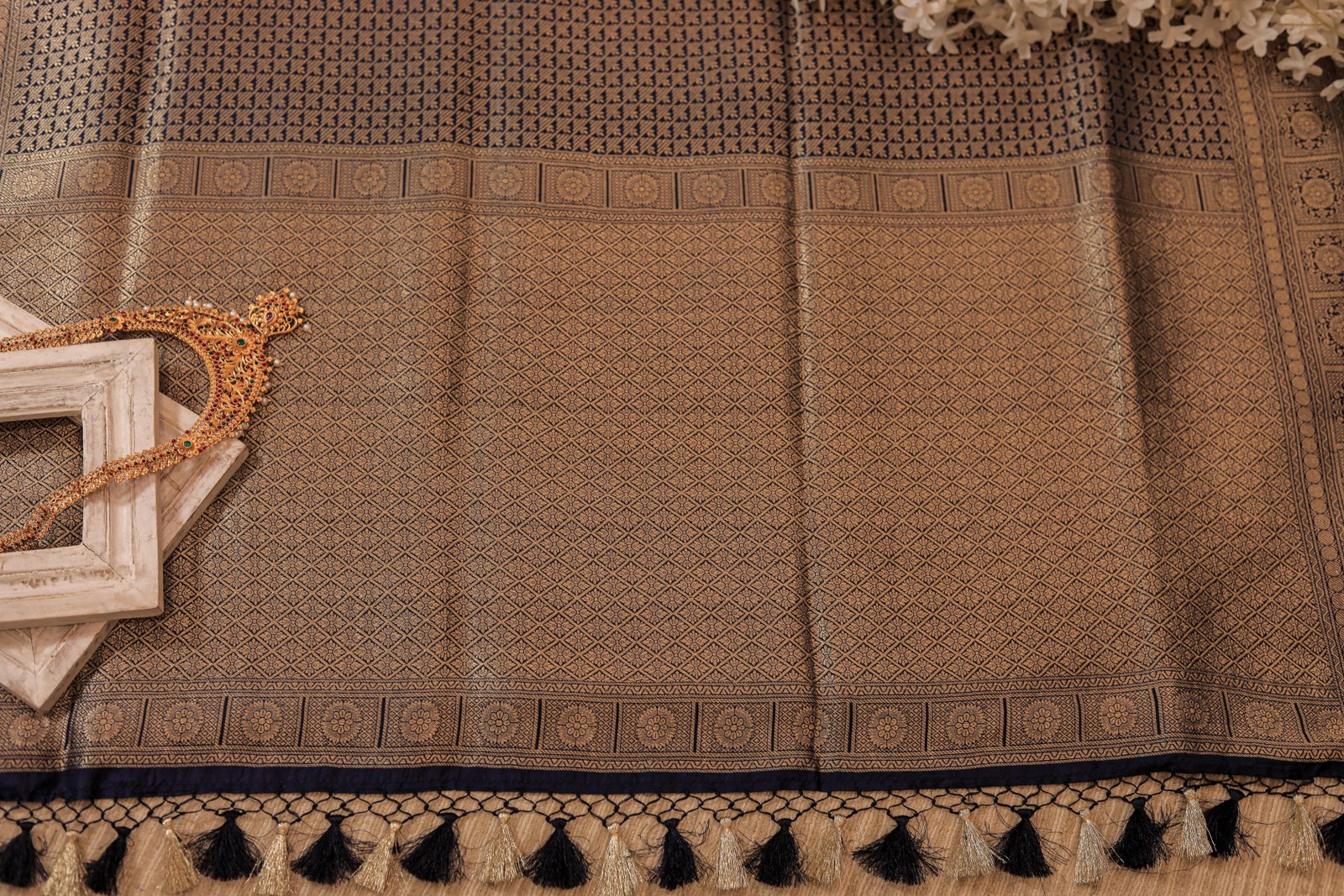 The deep navy blue hue lends a regal and versatile appeal, ideal for weddings, festive occasions, and formal evening events. The saree is beautifully accented with a grand zari border and an ornate pallu, showcasing the magnificence of age-old weaving techniques passed down through generations.