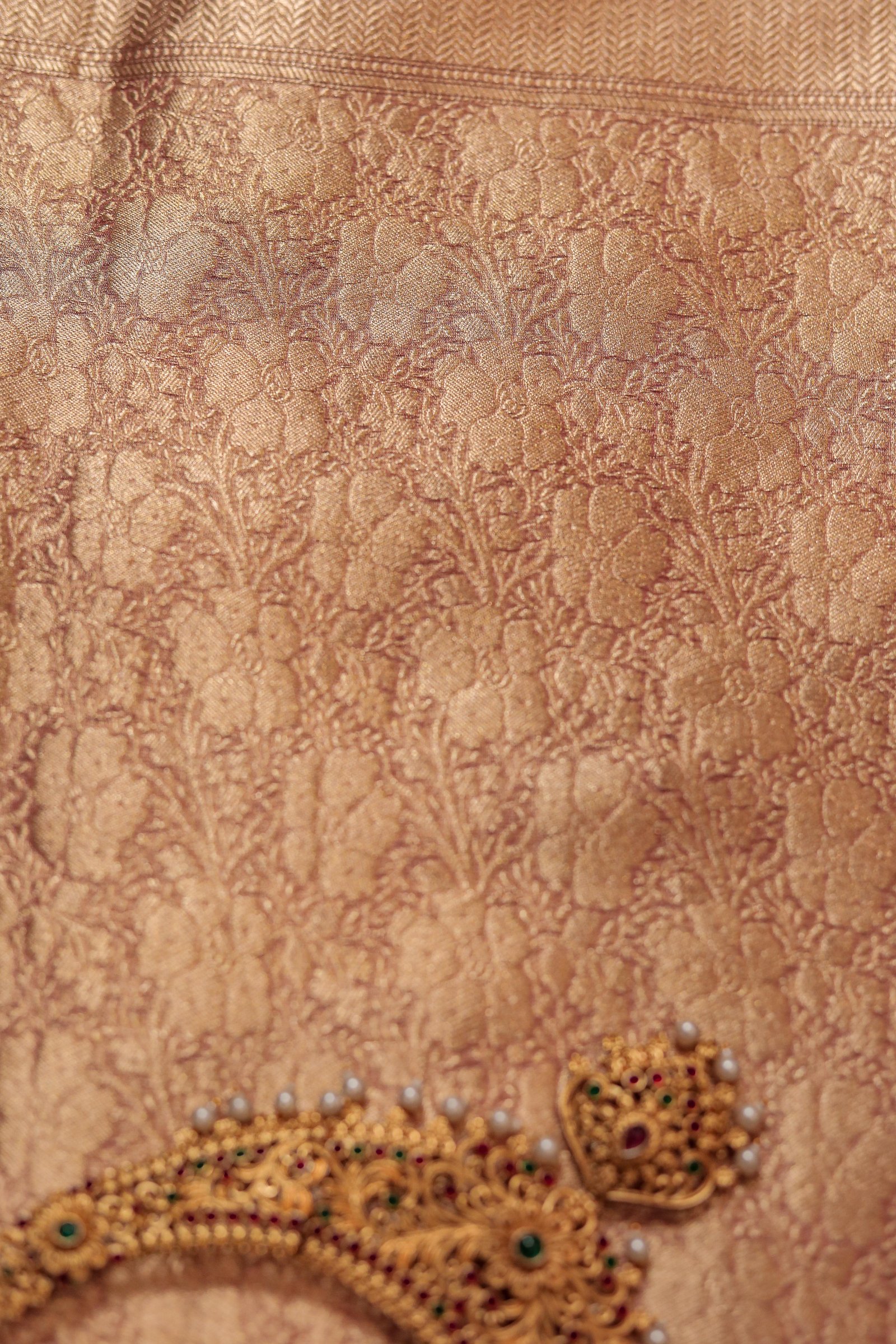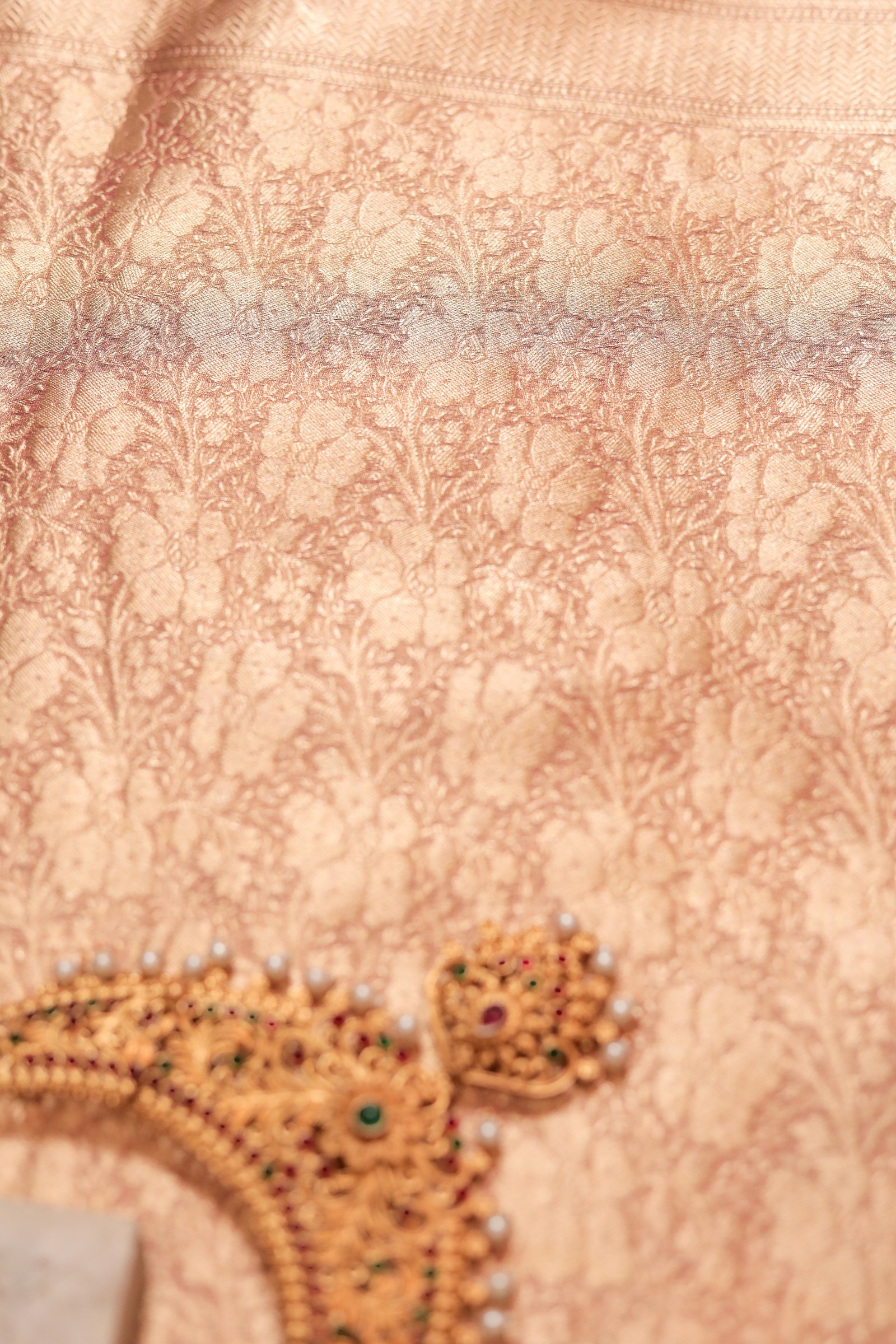 The soothing peach hue brings a gentle charm, perfect for both day and evening occasions. Adorned with intricate zari cutwork—featuring floral jaal and traditional motifs—this saree showcases the finesse of Banarasi artistry. A rich zari-woven border and pallu elevate its regal feel, while keeping it breezy and light.