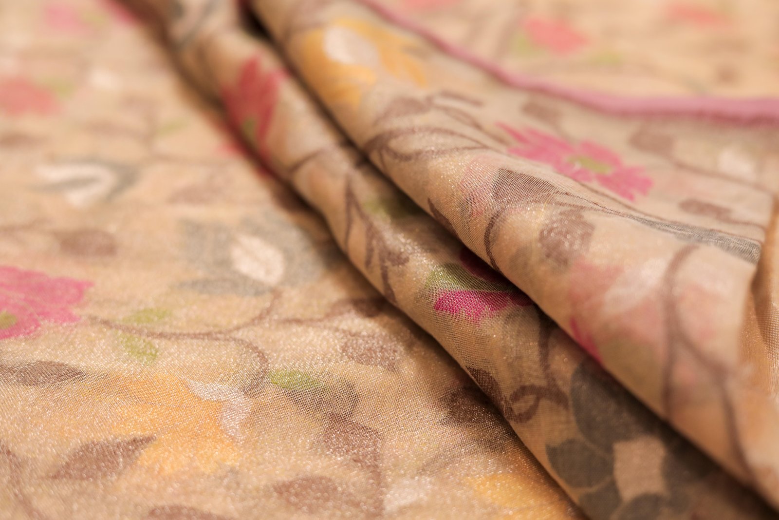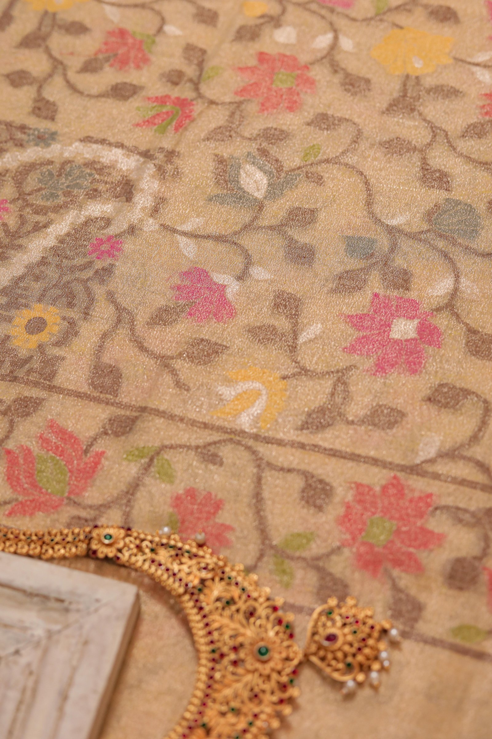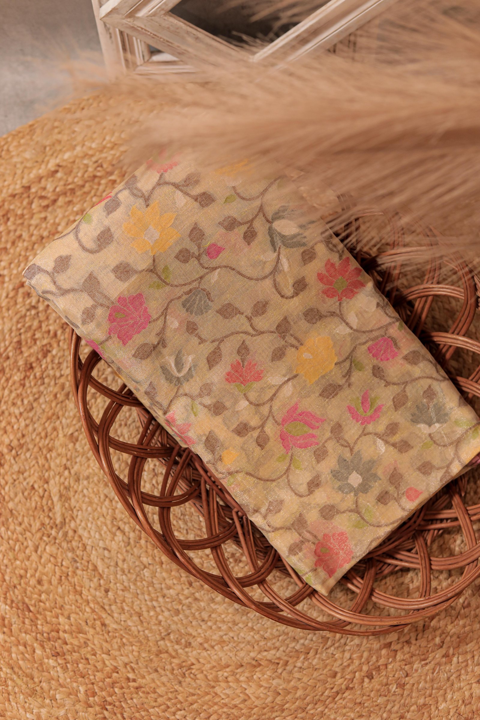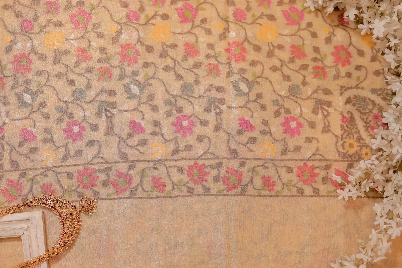 The highlight of this drape is the Meenakari cutwork, where multicolored floral and paisley motifs are meticulously woven into the fabric using the Jamdani technique, and then highlighted with detailed cutwork that lends a three-dimensional charm. The soft cream base enhances the vibrancy of the Meenakari detailing.
