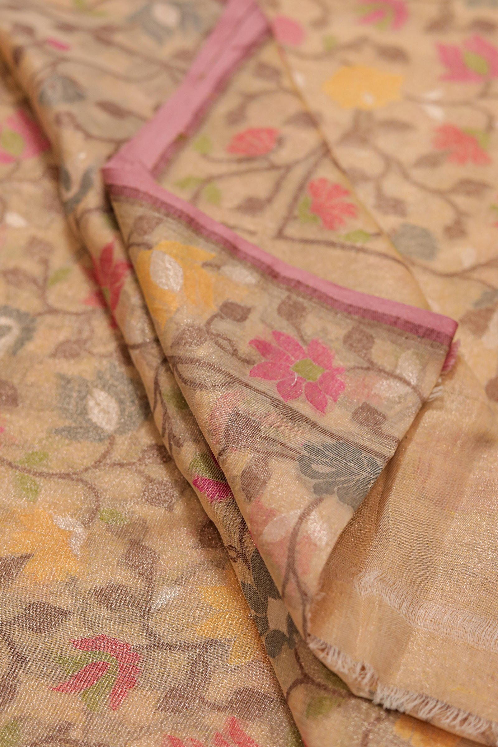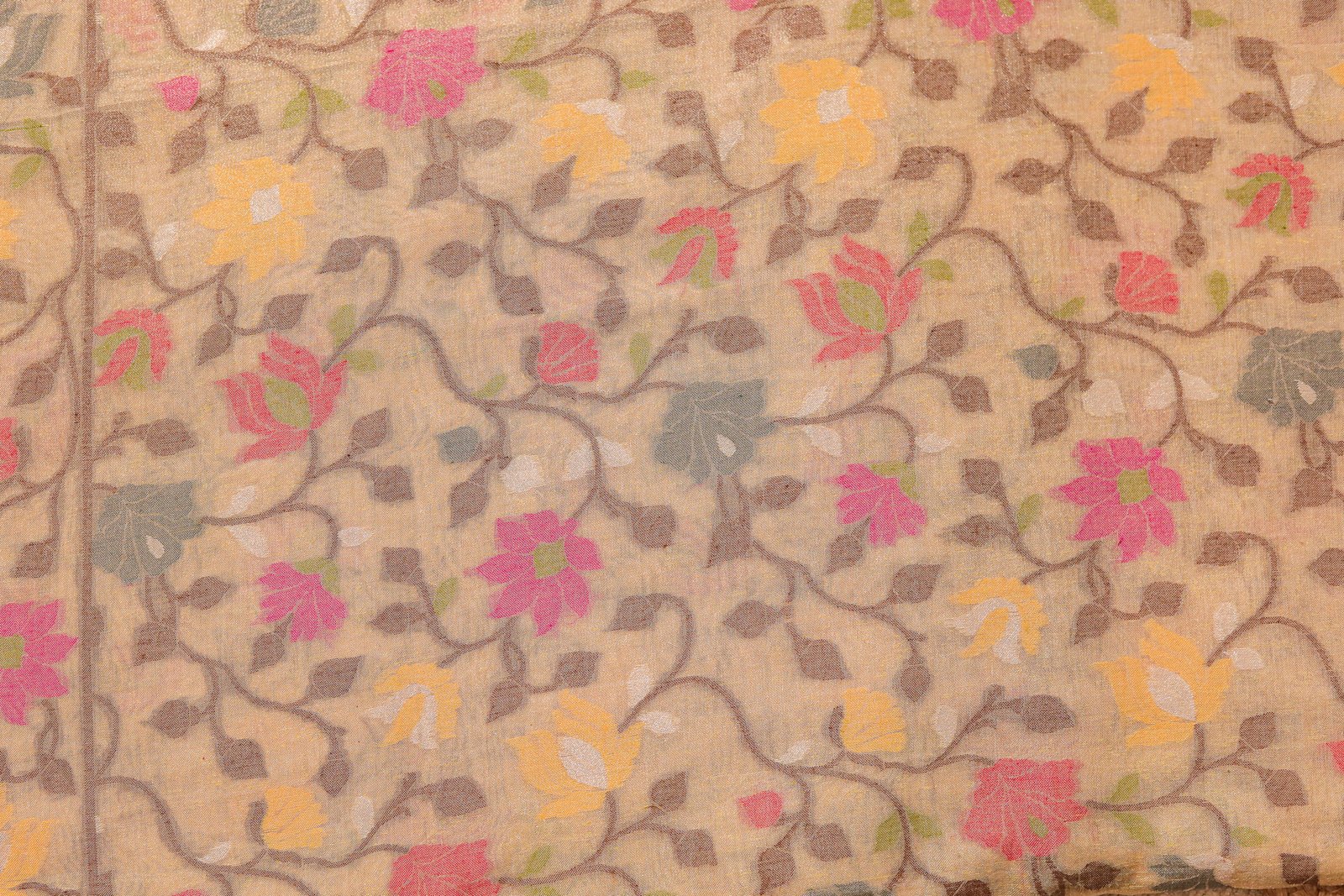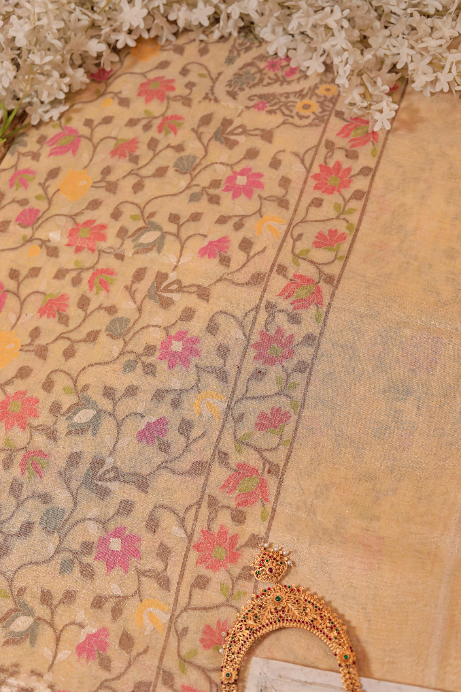Ethereal, lightweight, and intricately crafted—this Cream Pure Banarasi Jamdani Cotton Tissue Saree is a timeless expression of handwoven elegance. Blending the breathability of cotton with the delicate sheen of tissue silk, this saree is perfect for those who appreciate understated luxury.