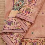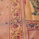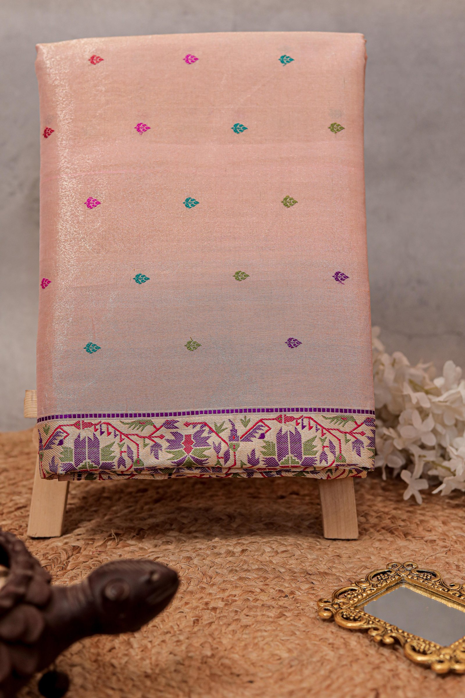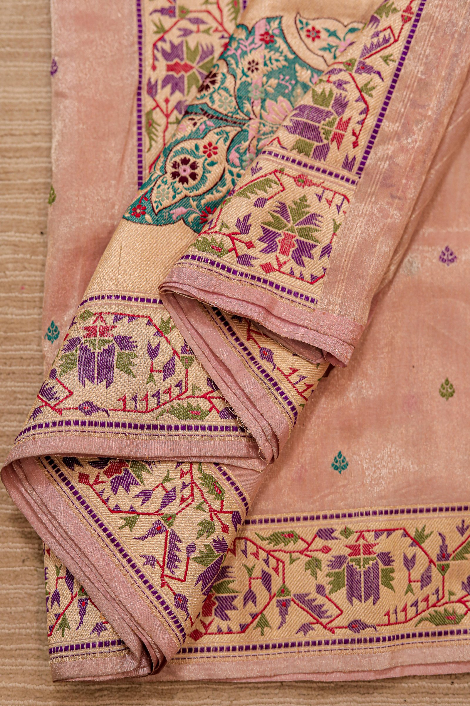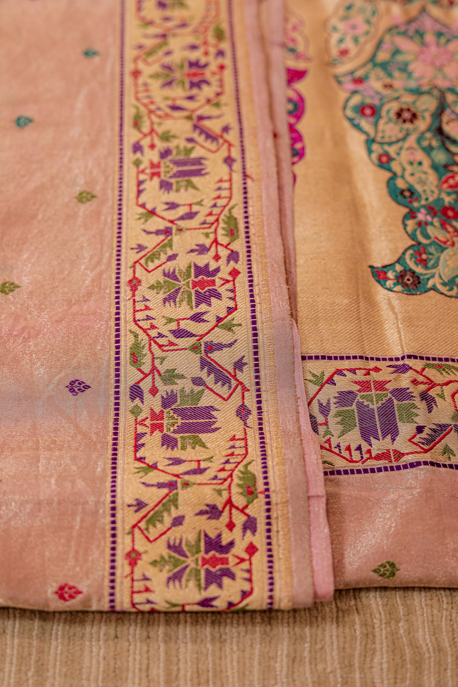 Radiate elegance with this handwoven peach Banarasi saree in pure Katan tissue silk, featuring paithani border and gold kadwa work. Lightweight, luminous, and perfect for weddings or festive occasions. Includes unstitched blouse piece.