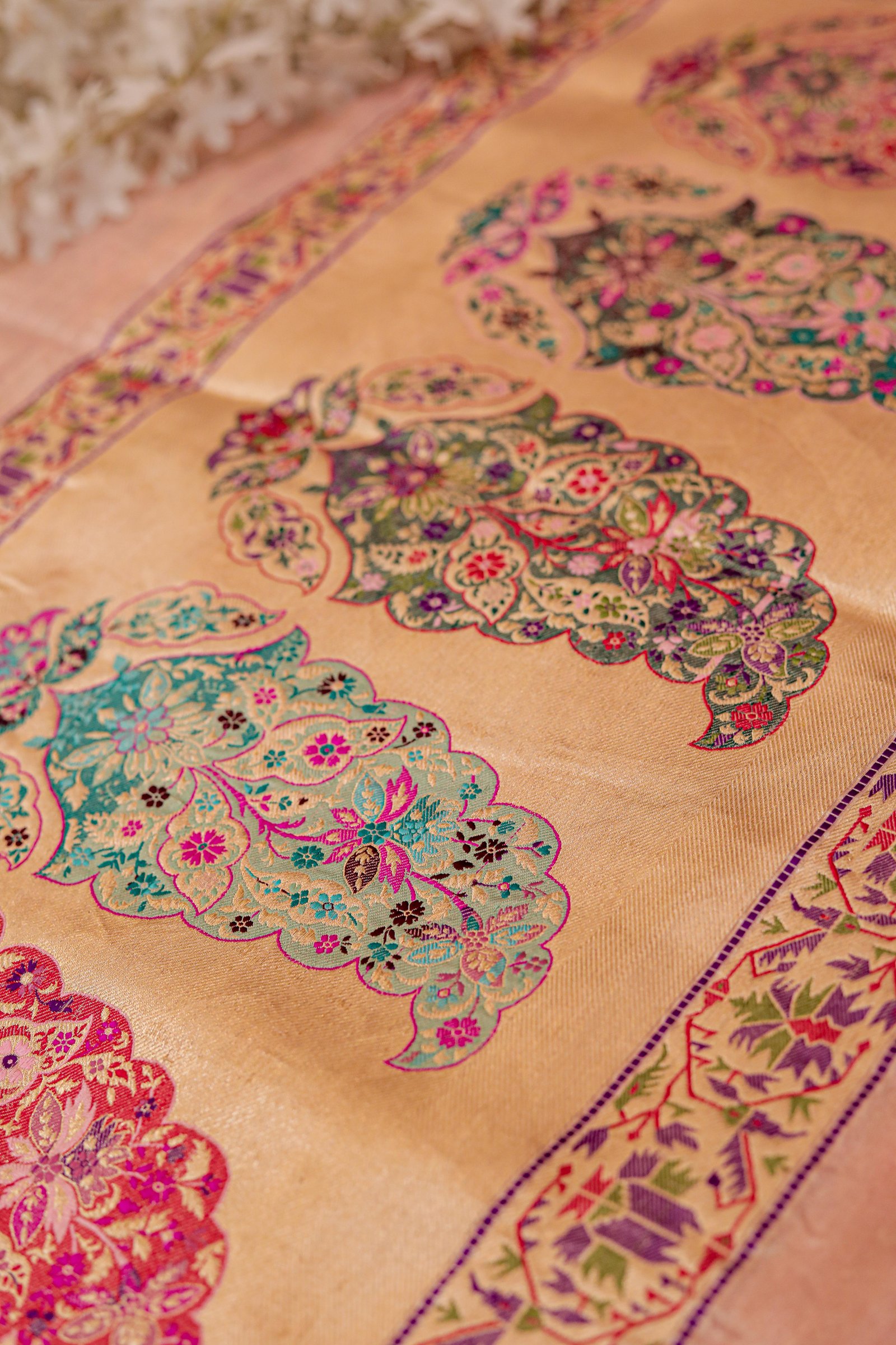 • Craftsmanship: Handwoven Banarasi with traditional Meenakari and gold zari detailing