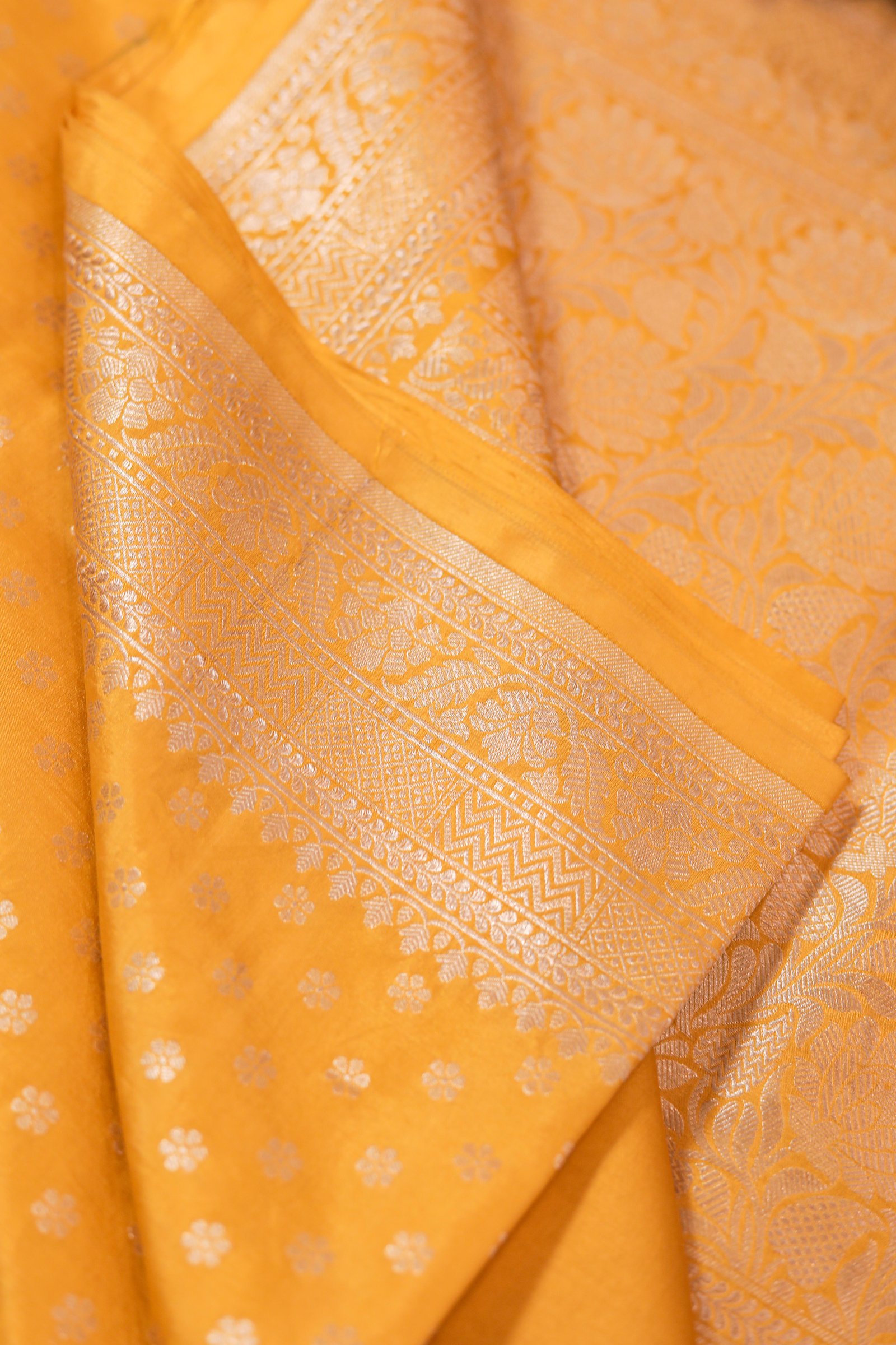 Discover the elegance of heritage with this mustard yellow Banarasi silk saree, featuring intricate gold zari weaving, traditional patterns, and a lustrous finish. Ideal for weddings, festive celebrations, and cultural events, this saree pairs rich tradition with timeless style. Made from premium Banarasi silk, it offers a graceful drape and includes a matching unstitched blouse piece.