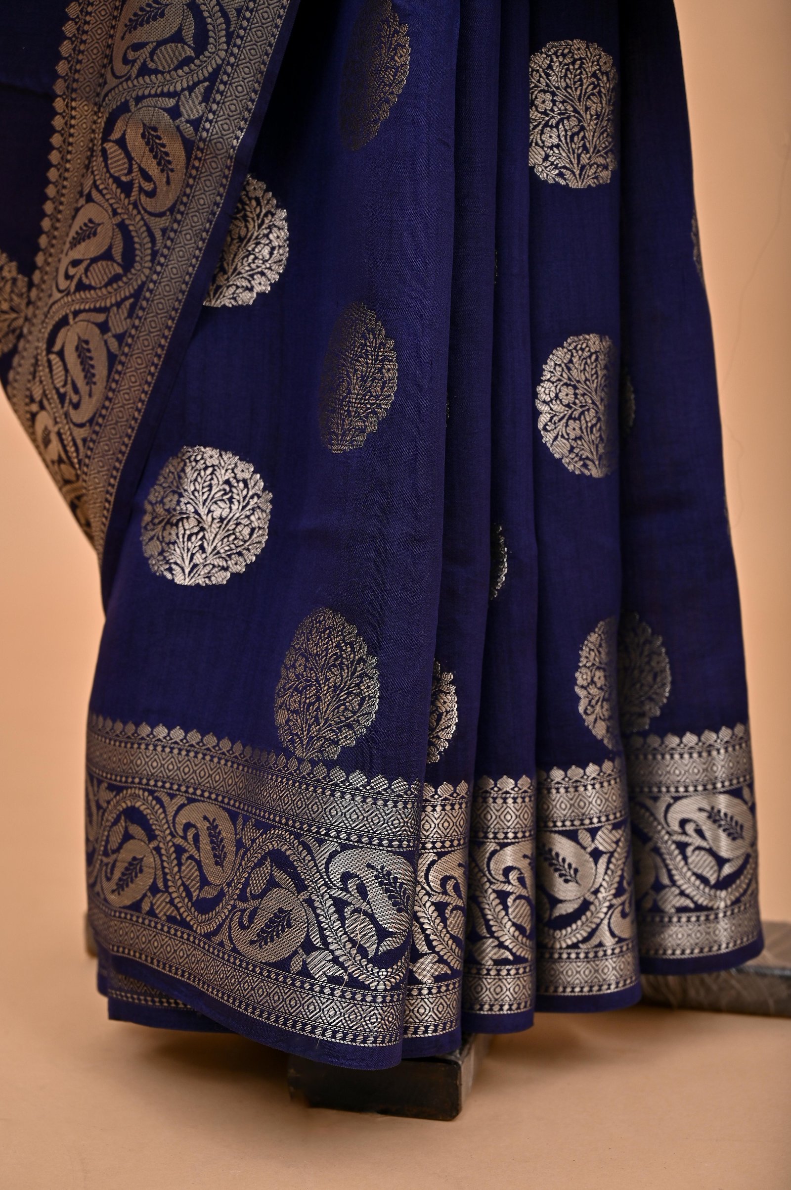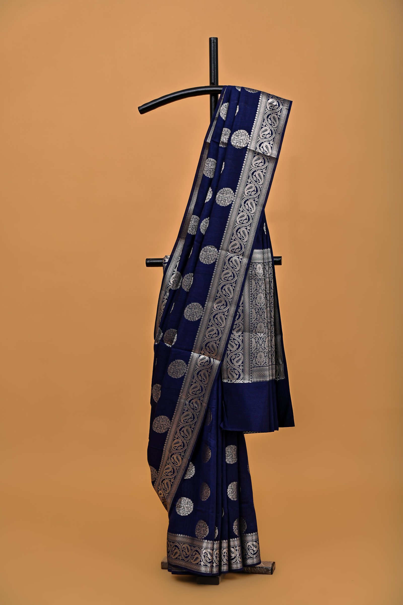Drape yourself in quiet sophistication with this stunning Navy Blue Spun Silk Banarasi Saree. With its soft texture and effortless fall, it brings together traditional elegance and modern comfort.