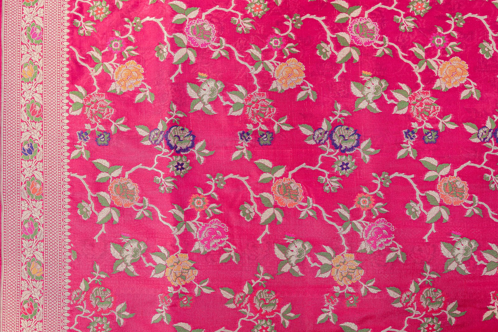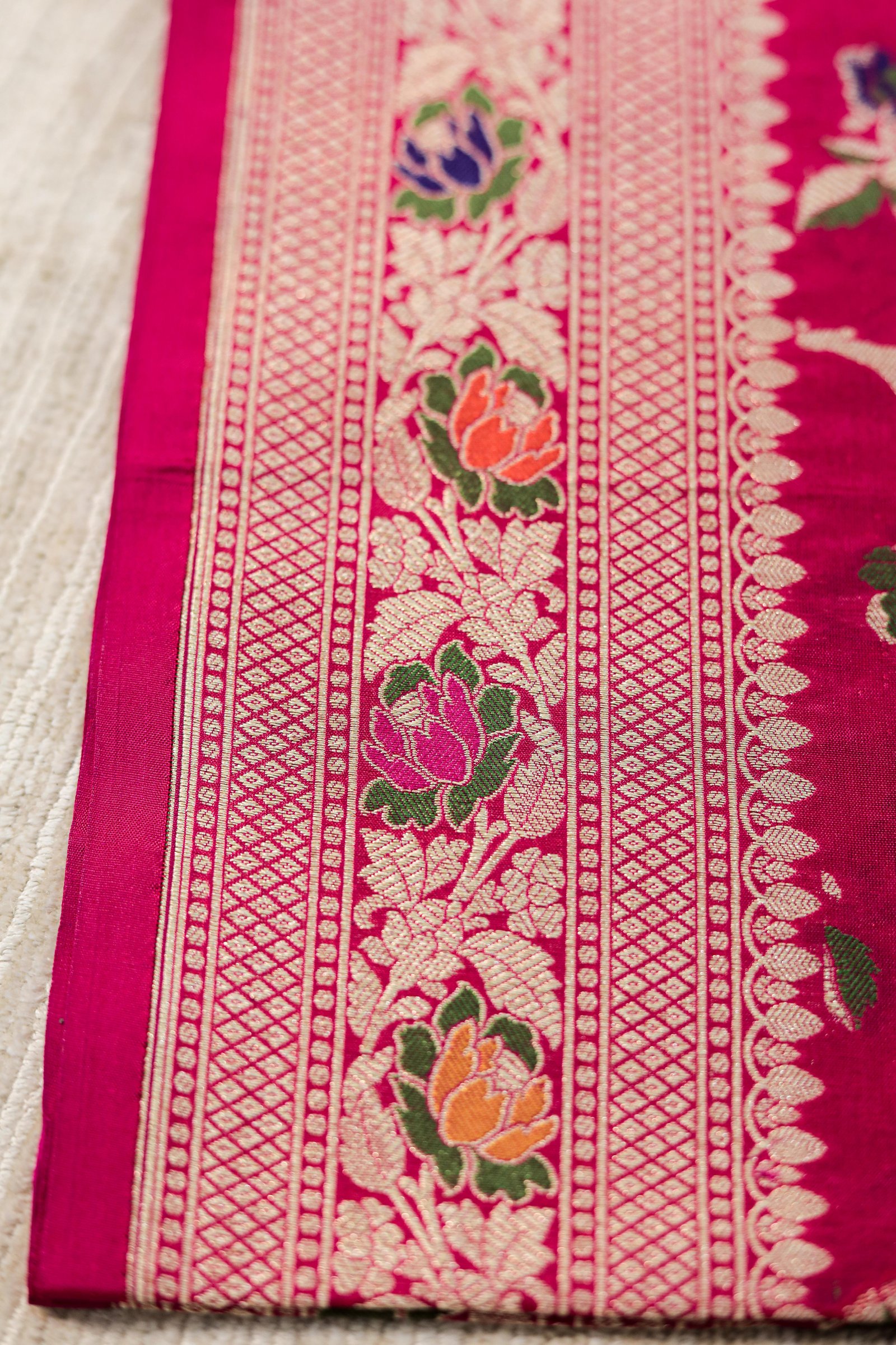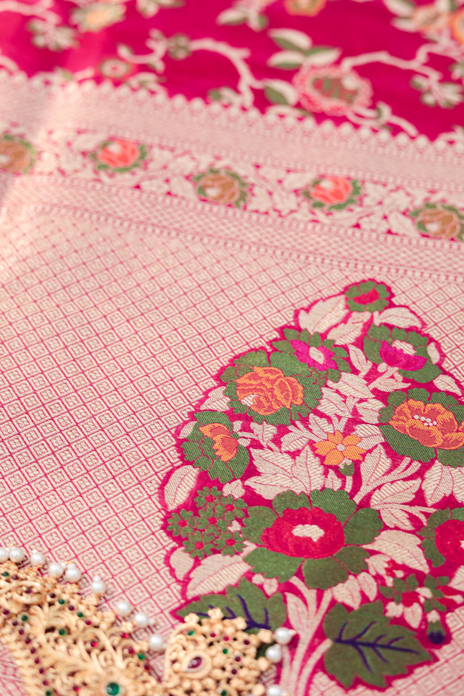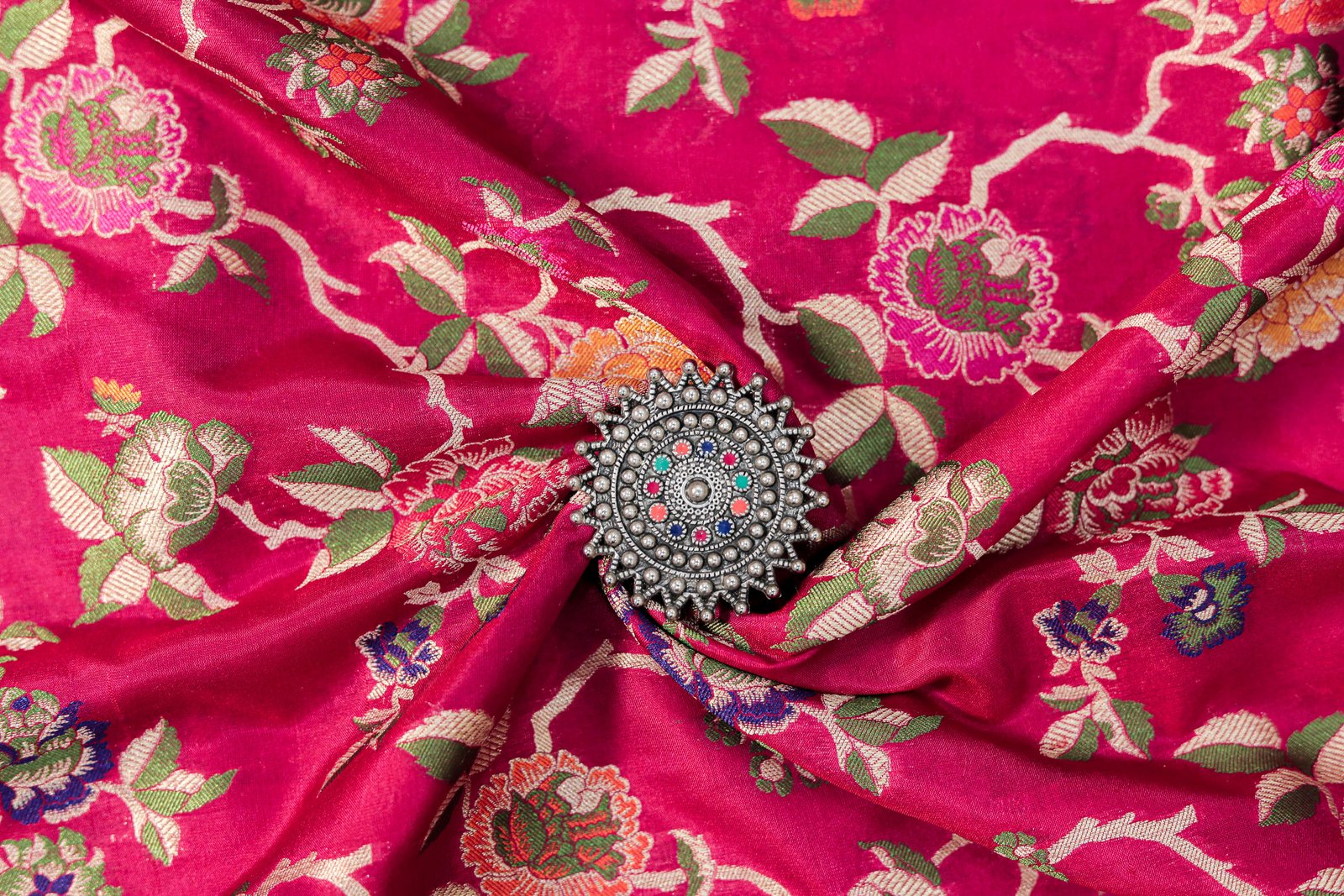 The luxurious silk drapes like poetry, while the intricate floral and paisley patterns shimmer with hints of gold, green, and magenta. Each saree is a masterpiece that takes weeks to weave and generations of skill to perfect.